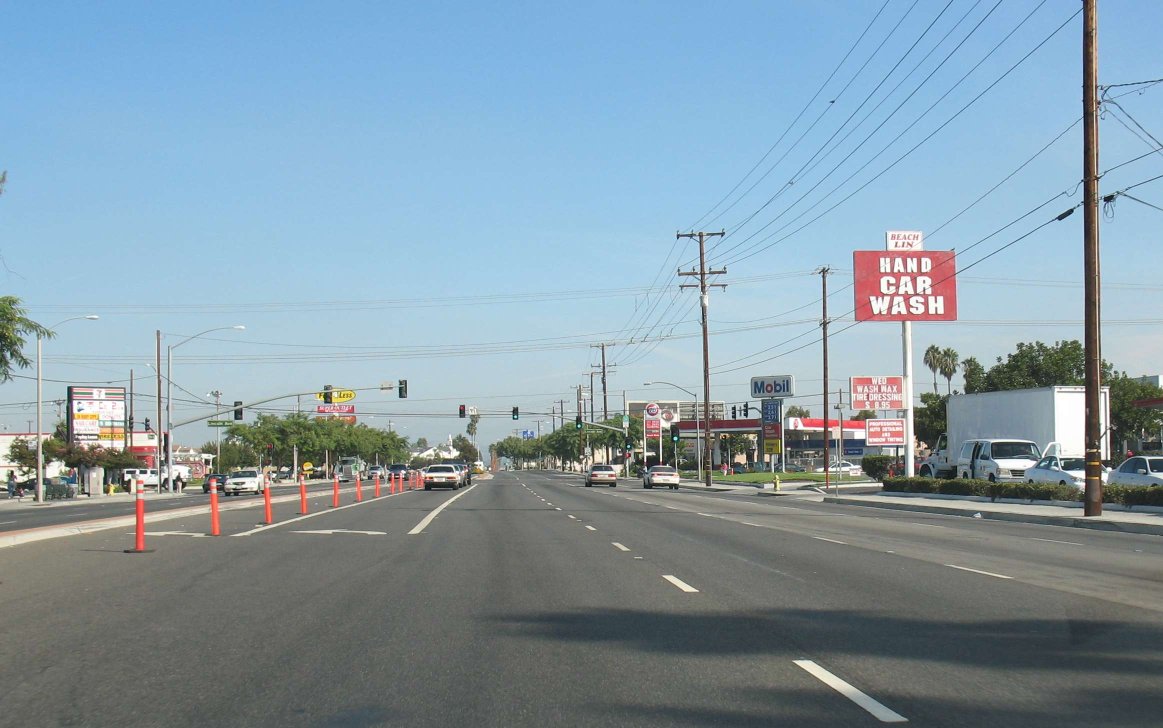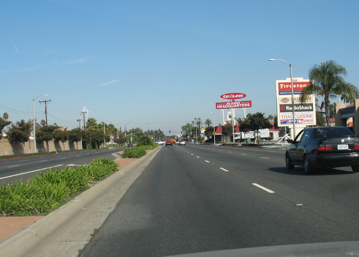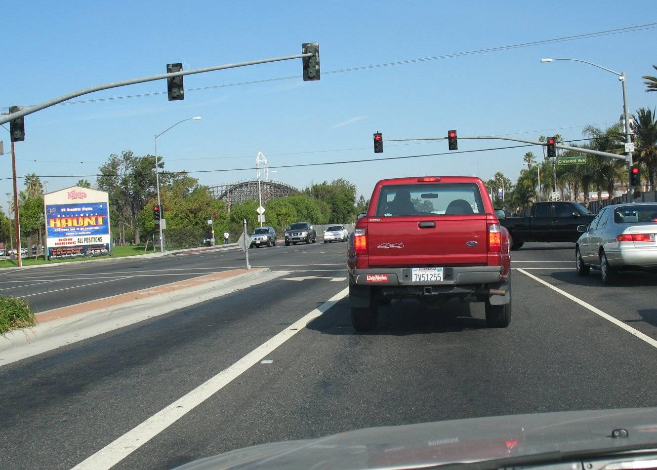 This shot is northbound on Beach Blvd approaching Lincoln Ave. Knott's is about 3/4 mile past the intersection on the left side. I can see the top of the Sky Cabin ride, but I know where to look. The Sky Cabin is a docile ride where you sit and the cabin spins slowly as you slowly go up and down.