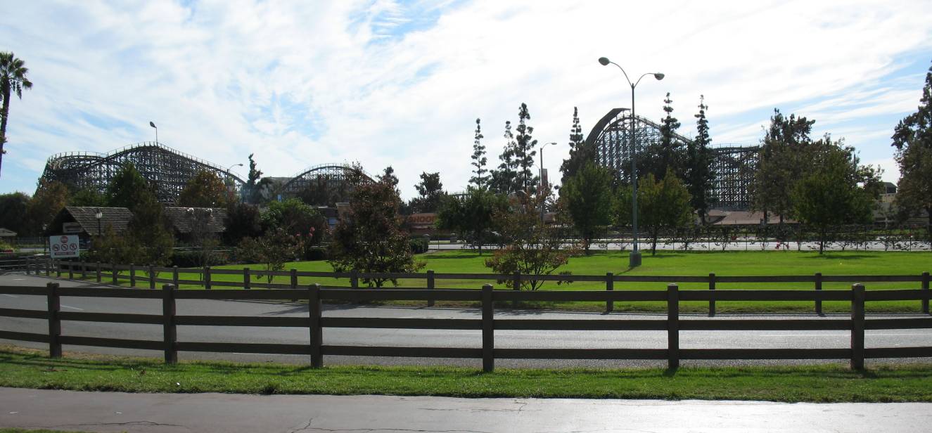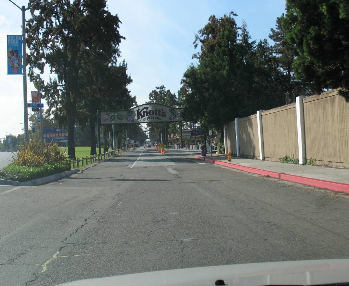 Getting closer, this is at Crescent Ave, which is the southern boundary of the park. Since it's early October they are running their Halloween Haunt program in the evenings and you can see it advertised on the sign on the left. Knott's has the ride park on the left side of Beach and Soak City, a water park, on the right.