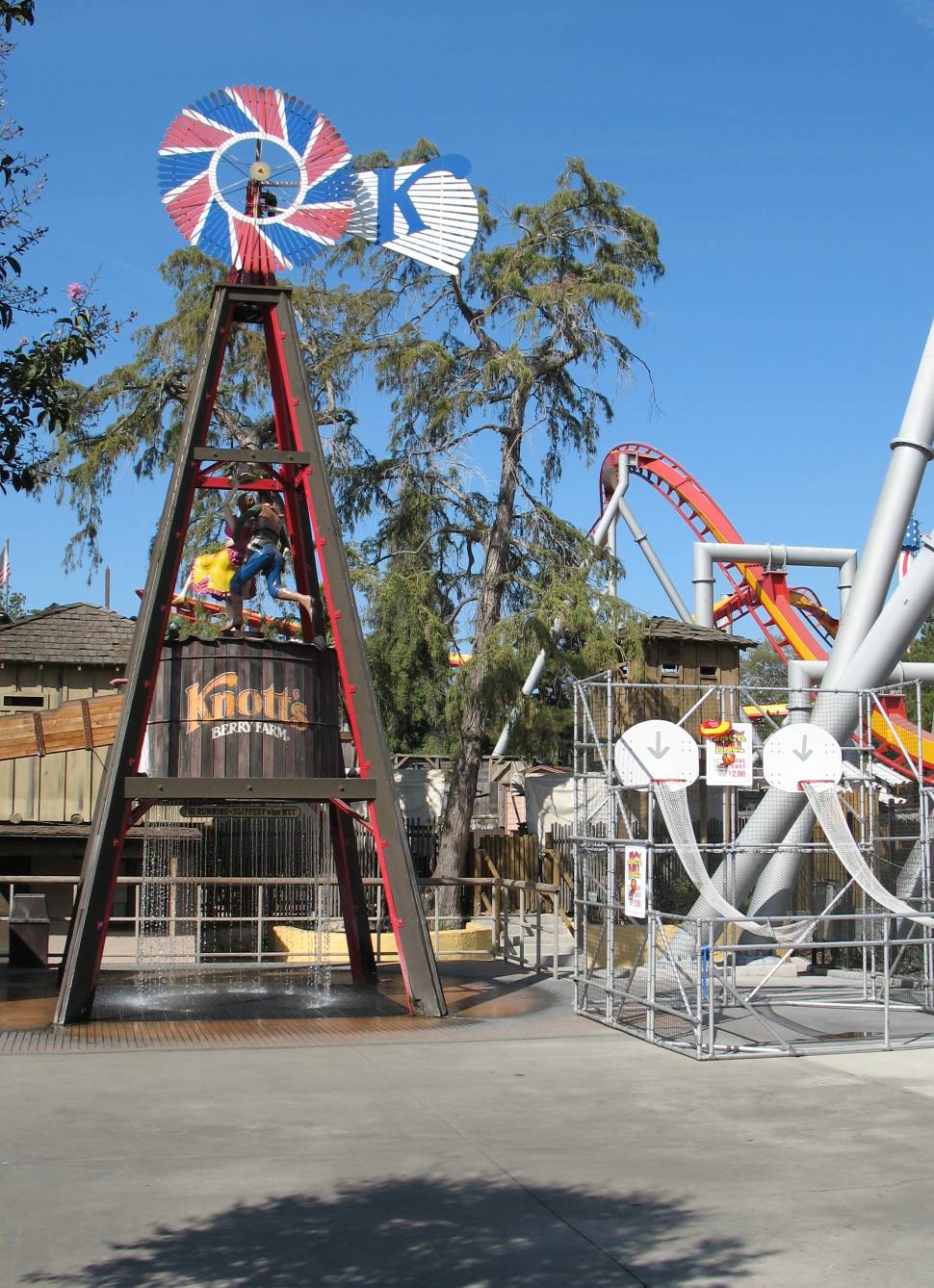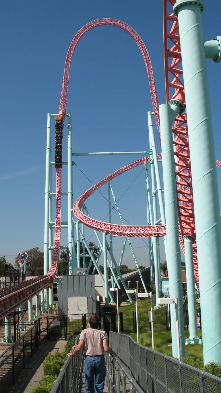 Watching a car make the climb from the entrance to Xcelerator. Me and the person right there turned around to watch the action. One of the differences between Knott's and a lot of parks is here you are right in the ride as you walk around. In this case the entrance is straight ahead so we walked under a good portion of the ride as we walked to the boarding area.