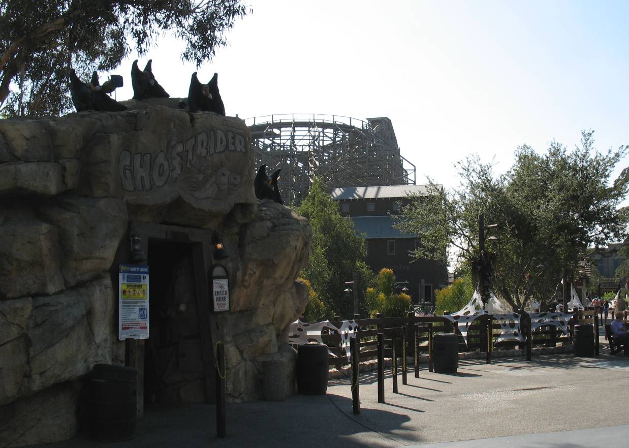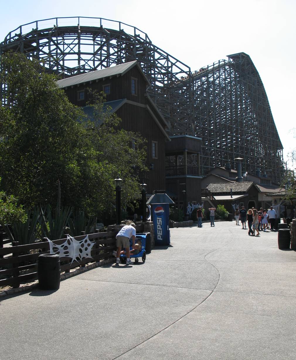 I missed the turn into the tunnel am continuing through to Crescent. It's a simple come-back to get into parking. Ahead is Ghostrider, the wooden coaster. I don't know if this is the signature ride but it is the longest.